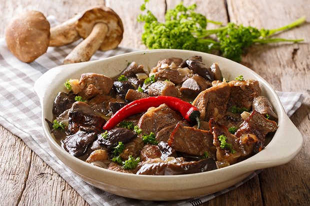 Das Filetfleisch abwaschen, abtrocknen und gut von Häuten und Sehnen befreien. Mit einem scharfen Messer in kleine Stücke schneiden. Das Öl in der Pfanne erhitzen und das Fleisch darin 3 Minuten schwenken. Herausnehmen, salzen und mit Paprikapulver bestreuen. Aus dem Mehl, der Butter und der gehackten Zwiebel unter ständigem Rühren eine braune Schwitze herstellen, die geputzten Eierschwammerl zugeben und mit Wildfond ablöschen. Zusammen mit dem Rotwein und dem Sauerrahm in die Pfanne zum Bratfett gießen und aufkochen lassen. Das Geschnetzelte mit Salz und Pfeffer würzen und mit Preiselbeeren verfeinern.