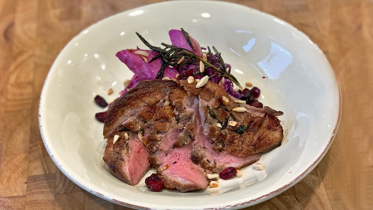 Dörrzwetschken und Äpfel auf die Zimtstange stecken, in die Wildentenbrüste je eine Tasche einschneiden, würzen, füllen, fixieren, anbraten und im Backrohr ca. 12 Minuten weiterbraten; vor dem Tranchieren die Zimtstange entfernen. Salatzutaten mit Rotkraut vermischen, ziehen lassen, ausdrücken und marinieren. Wildentenbrust in Scheiben schneiden, auf Rotkraut drapieren, mit Rotweinglace nappieren und eventuell mit eingelegten Nüssen garnieren.